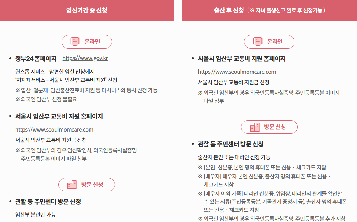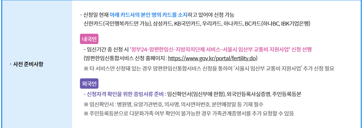 내국인의 경우는 맘 편한 임신통합서비스 신청을 통해서 서울시 임산부 교통비 지원사업 추가 신청이 필요하다고 합니다. 혹시나 타 서비스만 신청이 되어 있는 경우, 맘 편한 임신 통합서비스 신청을 통해서 '서울시 임산부 교통비 지원사업'을 추가 신청에 필요할 수 있습니다.