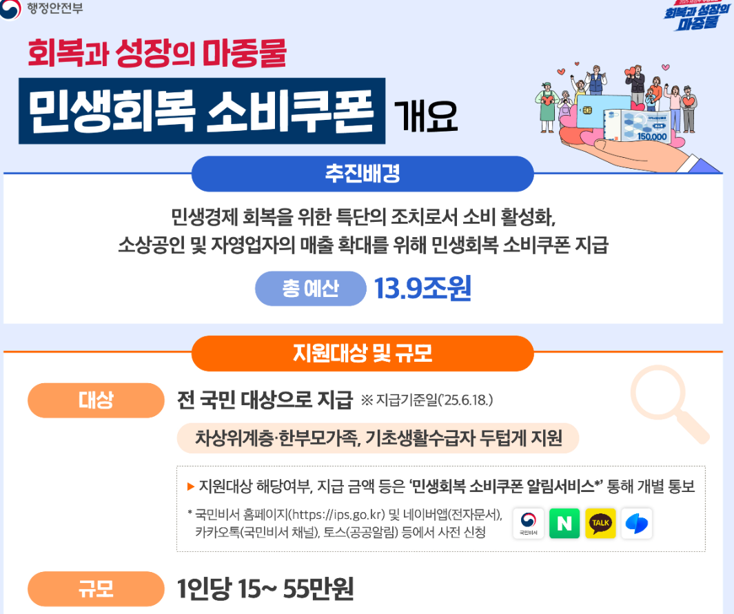 정부가 코로나 이후 침체된 민생·소상공인 매출을 회복하기 위해 전 국민에게 소비 쿠폰을 지급하는 지원 사업입니다.