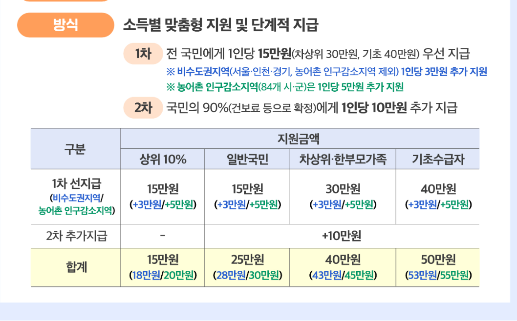 | 일반 국민 (상위 10% 제외) | 15만원 | +3~5만원 | +10만원 | 25만원 (비수도권 +3 → 28만, 농어촌 +5 → 30만) | |